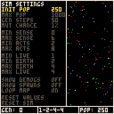 - Each new simulation will spawn a population of cells with random ACTIONS and SENSES